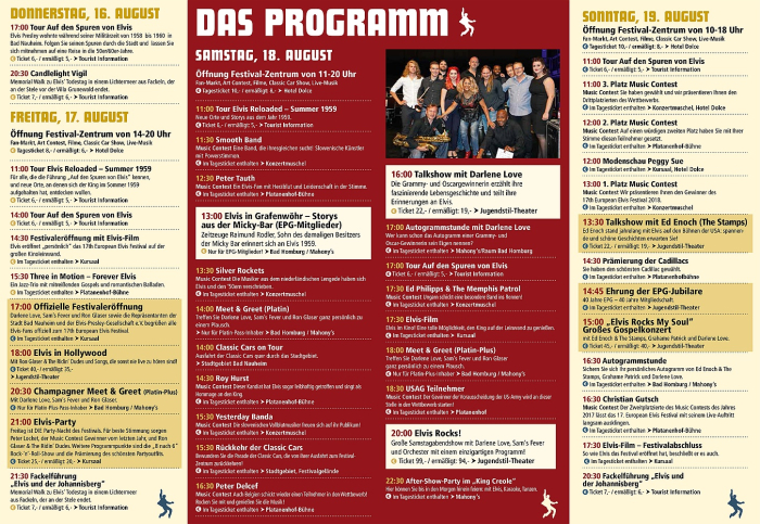Gäste aus aller Welt feiern mit namhaften Cover-Bands, Elvis-Filmen, Cadillacs und vielem mehr eine Hommage an den King of Rock'n'Roll!"