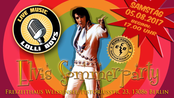 Am Sonnabend dem 05.08.2017 ab 17:00 Uhr (Einlass ab 16.30 Uhr) findet im Freizeithaus Weißensee unsere diesjährige Elvis Sommerparty statt.